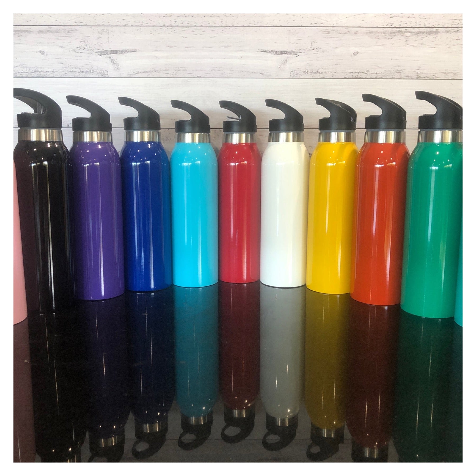 Double walled vacuum insulated stainless steel water bottles.