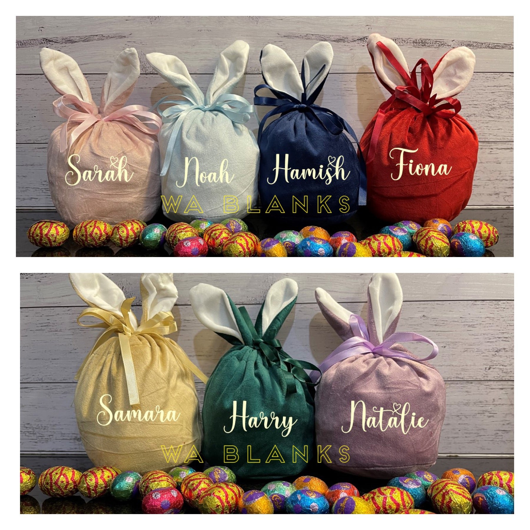 These gorgeous bunny bags measure 14cm in diameter and 19cm tall including the ears.